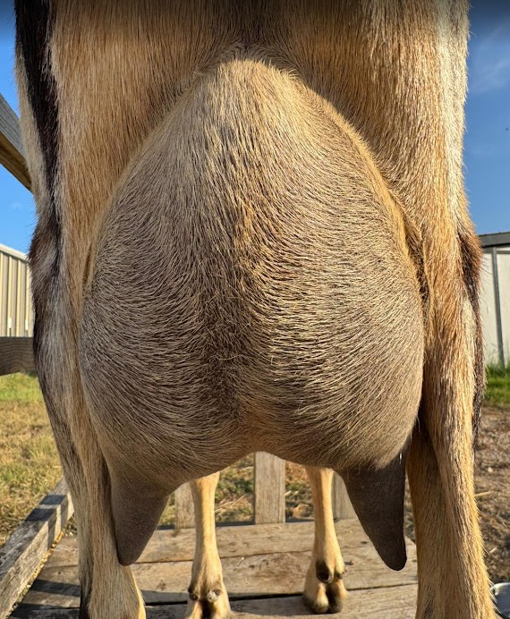 Echo is a incredibly productive doe who gives milk like there is no tomorrow! She has been known to give as much as a full gallon of milk twice a day. Her udder is still high and tight at eight years old. This is Echo’s udder at six months after freshening.