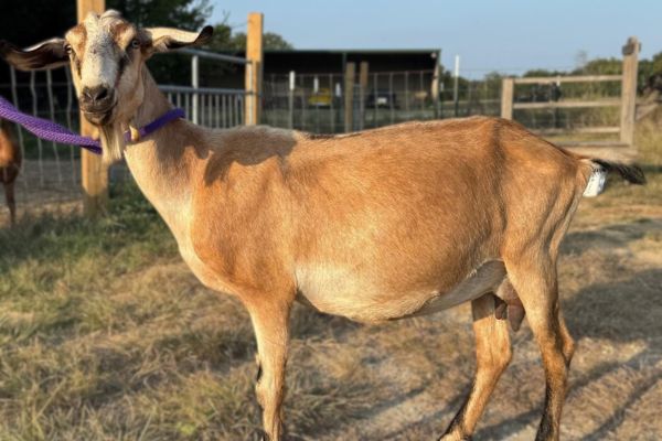 This sweet little lady is Lola’s daughter from 2025. Half Pint was a twin (with a buckling wether) and will be a first freshener in April 2026. She’s 75% Nubian, 25% Alpine, and she will be sold with her kids. She is bred to Traveler for (hopefully!) moonspotted kids. Check back in the spring if you are interested.